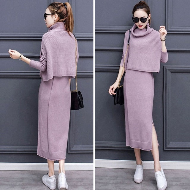 2018 New Autumn Winter Fashion Women TURTLENECK Bottoming sweater Tops A-Line dress Knit 2 Piece Set Ladies Casual Knitted Suit