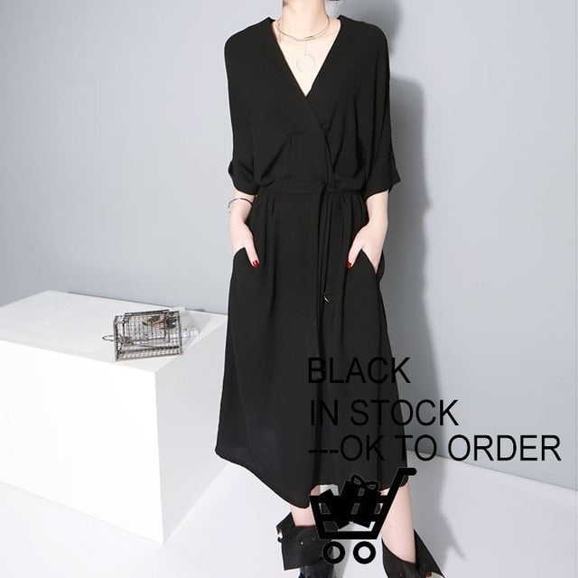 [EAM] 2019 New Spring winter V-collar Half Sleeve Bandgae Loose Temperament Loose Big Size Chiffon Dress Women Fashion JF733